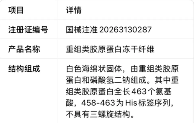 近日,创健医疗宣布其“重组类胶原蛋白冻干纤维”(商品名“悦白·韵境”)获NMPA批准上市,注册证编号为国械注准20263130287,适用于面部鱼尾纹真皮组织