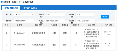 官网中国国家药监局药品审评中心(CDE)官网显示,石药集团以化药注册分类2.2类申报的司美格鲁肽注射液上市申请已获得受理。