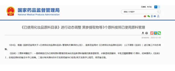 1月4日,国家药监局发布通知,宣布对《已使用化妆品原料目录》实施第三次动态调整,进一步规范化妆品原料管理体系。本次调整重点聚焦原料纳入与信息规范两大方面。在原料纳入方面,黑参提取物、水解透明质酸锌、半乳甘露聚糖3个原料正式纳入《目录》Ⅰ。这3个原料此前已按“已使用原料”管理并取消化妆品新原料备案,经审查后完成目录归类,相关信息在原料备注中予以明确。