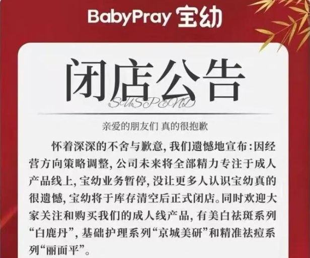 宣称“医研共创”的婴童功效性护肤品牌宝幼(BabyPray)官方旗舰店发布闭店公告称,因经营方向策略调整,公司未来将把全部精力专注于成人产品线上,宝幼业务暂停,并将于库存清空后正式闭店。