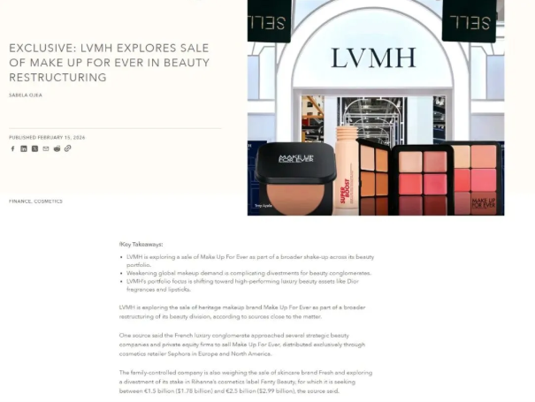 近日,多家外媒报道称LVMH正在评估出售旗下护肤品牌馥蕾诗(Fresh),同时为彩妆品牌玫珂菲(MakeUpForEver)寻找潜在买家,并考虑减持FentyBeauty部分股权。此举反映出美妆行业增长