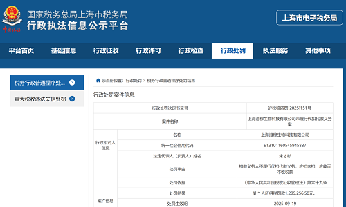 近日,至本母公司上海澄穆生物科技有限公司因未履行代扣代缴义务,被国家税务总局上海市税务局第四稽查局,处以个人所得税罚款129.93万元。 据行政处罚书披露,本次澄穆生物