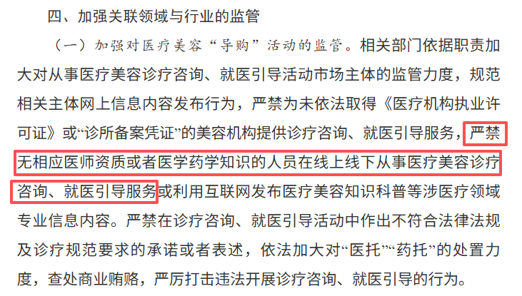 在2023年,市场监管总局等十一部门联合印发《关于进一步加强医疗美容行业监管工作的指导意见》(以下简称《指导意见》)其中就已经提到:“......严禁无相应医师资质或者医学药学知识的人员在线上线下从事医疗美容诊疗咨询、就医引导服务。”