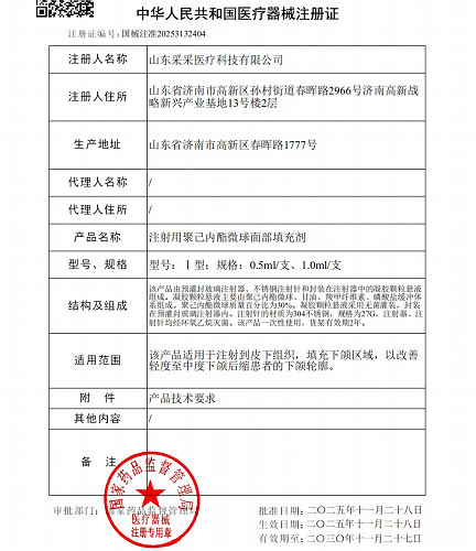 2025年11月28日,山东采采医疗科技有限公司申报的"注射用聚己内酯微球面部填充剂"获国家药品监督管理(NMPA)批准,注册证编号为:国械注准20253132404。 该产品是国内首款采用可降解聚己内酯(PCL)微球材料的下颌适应症产品。适用于注射到皮下组织,填充下颌区域,以改善轻度至中度下颌后缩患者的下颌轮廓。qdv陕西医学美学美容杂志社