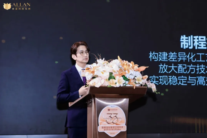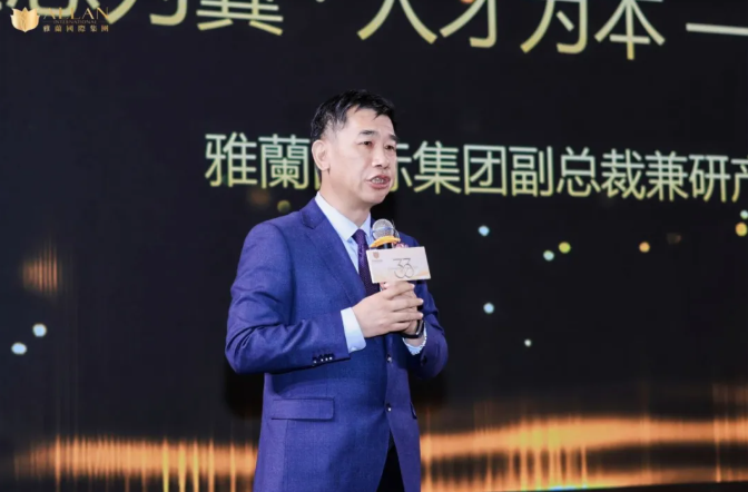 雅蘭国际健康美容集团总裁何毅彬发表主旨演讲,回顾集团 33 年坚守 “敬天爱人·成人之美” 的经营哲学,从初创品牌到构建全产业体系,近年携手顶尖科研机构布局 “妆消械食” 大健康领域。他指出,智谷落成是重要里程碑,打造了研发、智造等全链路产业生态,汇聚多国科研力量助力技术与标准升级。未来集团将以 “四力” 为核心战略,深化科研与智能化转型,携手伙伴以智谷为新起点,共创下一个 33 年辉煌。