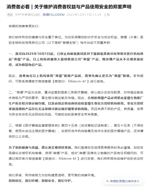 随着医美行业的竞争持续加剧,“互联网医美第一股”新氧与上游供应商的矛盾再度升级。日前,斐缦生物在其官微明确宣布:“自2025年10月1日起,已停止向新氧集团及其相关机构供应‘弗缦’产品,并警示消费者注意相关风险。”