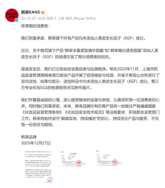 除了坚决否认添加该成分,韩束并透露了一个重要信息:早在2025年11月,上海市药品监督管理局已对相关产品进行过现场核验和双向送检,结果显示未检出表皮生长因子。