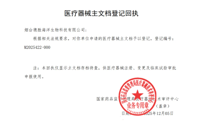 近日,爱博医疗子公司德胜生物传来捷报,其细胞外基质ECM成功通过医疗器械主文档登记。至此,德胜生物已有“细胞外基质ECM”“多聚核苷酸”“多聚脱氧核糖核苷酸”“Ⅰ型胶原蛋白”“脱细胞真皮基质”和“鱼皮脱细胞真皮基质”6款原料完成登记。这标志着德胜生物在天然生物材料领域的产品布局日臻完善,彰显了其强劲的研发技术实力,更为相关医疗器械的安全有效性筑牢根基。