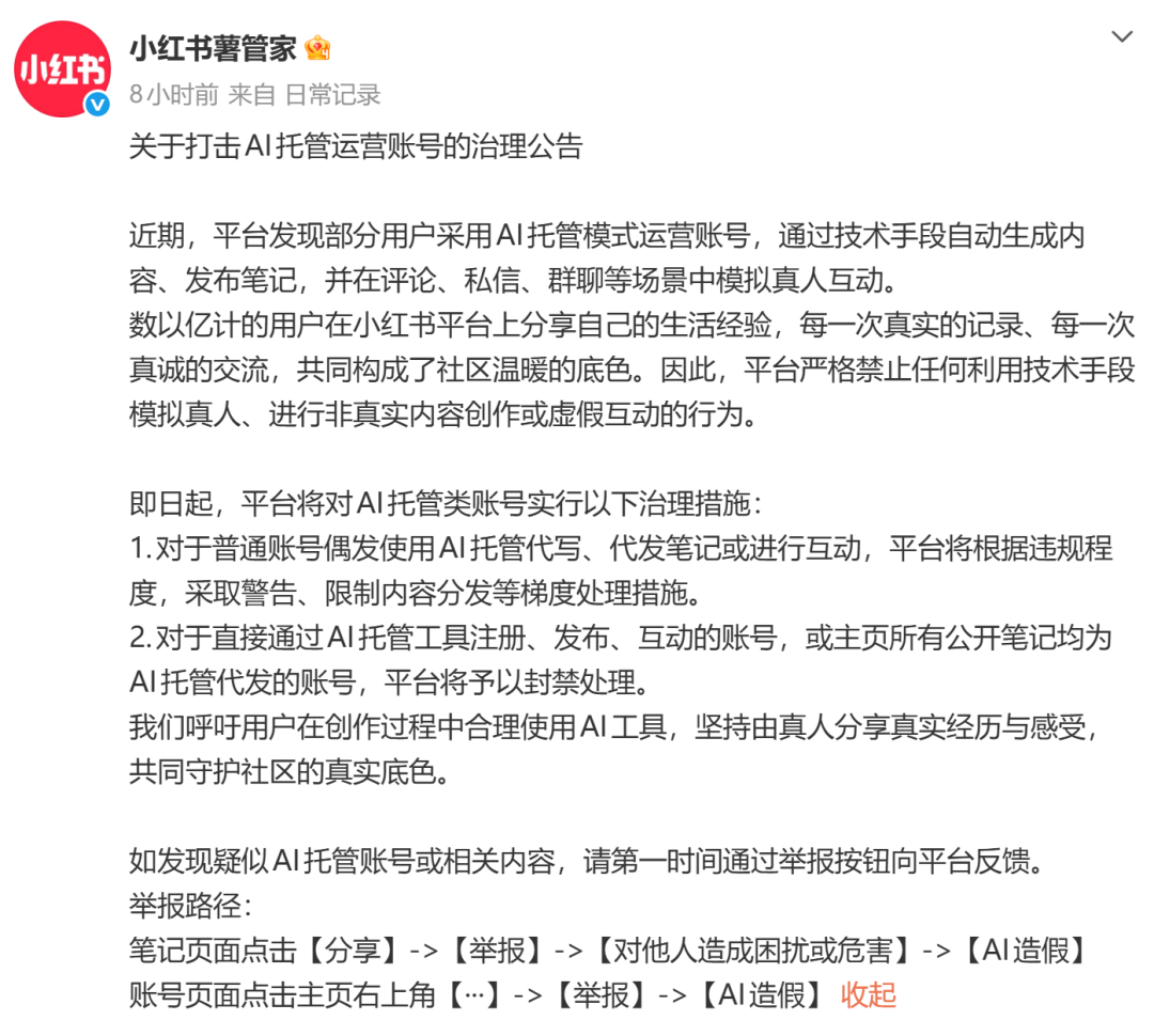 3月10日,小红书官方账号“薯管家”发布治理公告,明确打击AI托管运营账号,医美领域为监管重点。根据新规,完全由AI完成注册、发布、互动,或主页所有笔记均为AI代发的账号将直接封禁;偶发性使用AI代写代发且未经人工审核的账号,也将面临警告、限流乃至封号处罚。