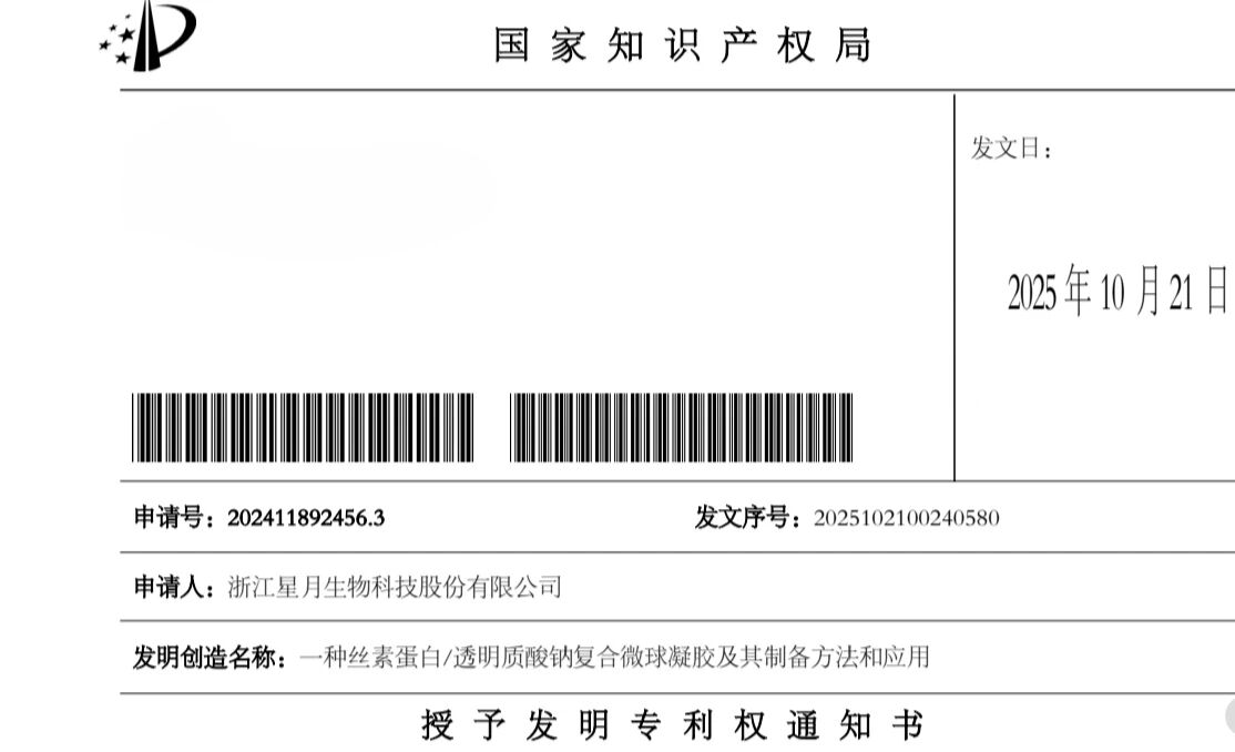 10月21日,星月生物收到国家知识产权局正式发文(序号:2025102100240350),其自主研发的《一种丝素蛋白/透明质酸钠复合微球凝胶及其制备方法和应用》发明专利成功获授权(专利号:20241