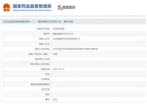 10月21日,爱美客在官方微信公众号宣布,完成首个化妆品新原料备案,核心成分“甘草查尔酮A”。该成分源自中国特色植物甘草,可作为皮肤保护剂和保湿剂用于化妆品。爱美