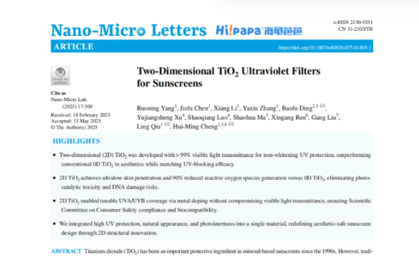 日前,国际材料科学顶级期刊《Nano-microLetters》正式收录了海龟爸爸在防晒剂结构改性方面的重大研究成果。一直被欧美定义的防晒技术,被仅成立6年的中国企业突破,中国美妆