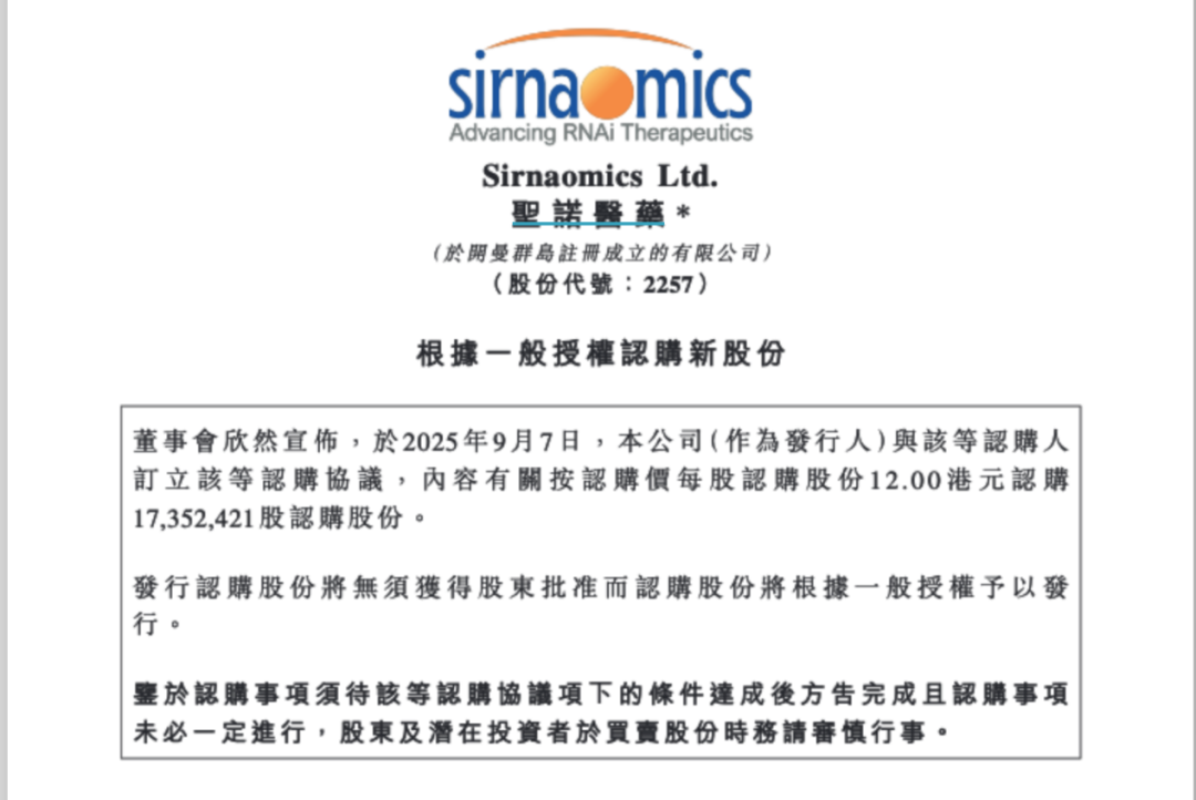 9月8日,圣诺医药发布公告称,公司与华熙生物科技(香港)有限公司等四位投资者签署认购协议,以每股12港元的价格配售1735.24万股新股,相当于公司现有已发行股本的约16.50%,以及经配发