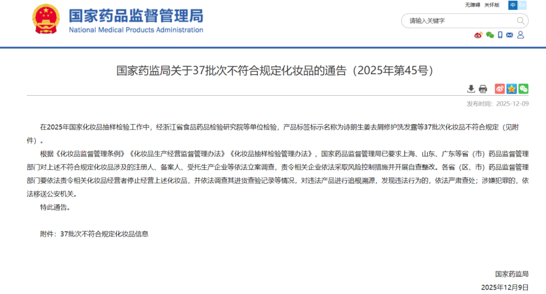 2025年12月9日,国家药监局发布通告称,在年度国家化妆品抽样检验中,经浙江省食品药品检验研究院等检验机构检测,检出37批次化妆品不符合规定。针对此次抽检不合格情况,上海、山东