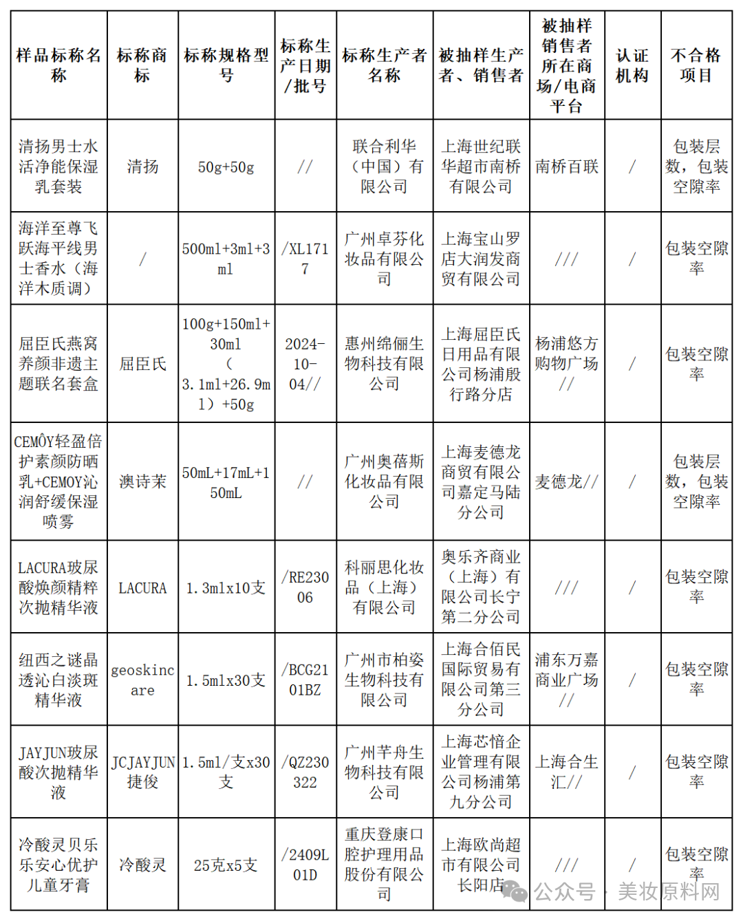 近日,上海市市场监管局近期抽查150批次化妆品,共8批次产品因过度包装不合格,涉及清扬、屈臣氏、CEMÔY、纽西之谜等品牌,冷酸灵儿童牙膏也因包装空隙率不达标被点名。监管