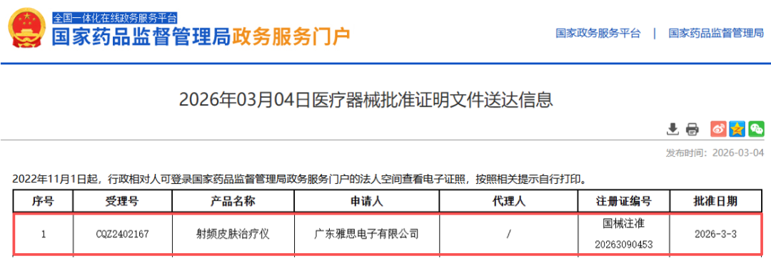 根据国家药品监督管理局2026年03月04日医疗器械批准证明文件送达信息显示,广东雅思电子有限公司申报的射频皮肤治疗仪获NMPA批准上市,注册证编号为国械注准20263090453。广东