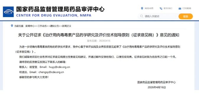 2026年4月16日,国家药监局药品审评中心(CDE)正式发布《治疗用肉毒毒素产品药学研究及评价技术指导原则(征求意见稿)》,面向社会公开征求意见,反馈截止时间为2026年5月16日。这是我