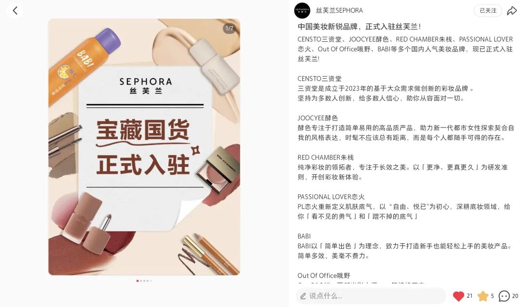 近日,丝芙兰中国集中官宣酵色、朱栈、恋火、BABI、OUTOFOFFICE及三资堂六大国产新锐彩妆品牌同步入驻。至此,2025年内丝芙兰已新增至少13个本土品牌,占比近七成。这批入驻品