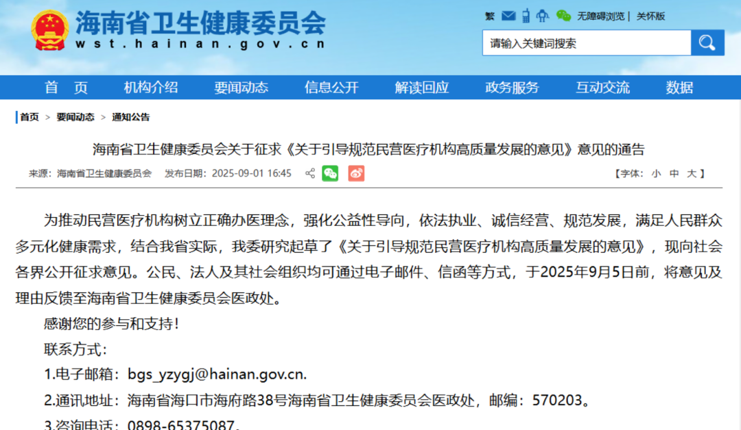 近日,海南省卫健委发布《关于引导规范民营医疗机构高质量发展的意见(征求意见稿)》。首次提出除三级中医、口腔、康复等少数专科外,原则上不再新增审批二级及以下民营医院,并明